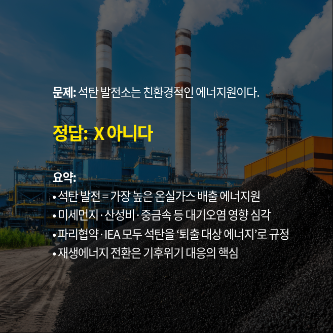 기후동행퀴즈 11월 27일 정답 기후행동퀴즈정답 — 석탄 발전은 왜 친환경 에너지가 아닐까?