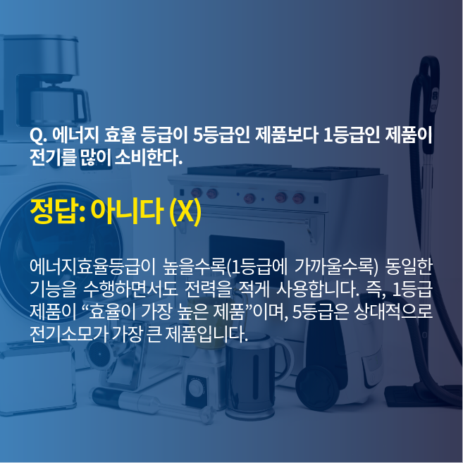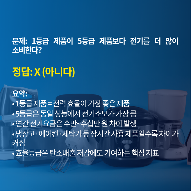 오늘의 기후동행퀴즈는 많은 사람들이 헷갈리는 “에너지효율등급 1등급 vs 5등급의 전력 소비량 차이”에 관한 문제였습니다. 1등급 제품이 더 많은 기능을 갖추고 있어 전기를 더 쓸 것 같다고 착각하기도 하지만, 실제로는 그 반대입니다. 이번 원고에서는 에너지효율등급이 무엇인지, 1등급 제품이 왜 전기를 적게 사용하는지, 실제 전기요금 절감 규모는 어느 정도인지 과학적으로 분석해 정리했습니다.