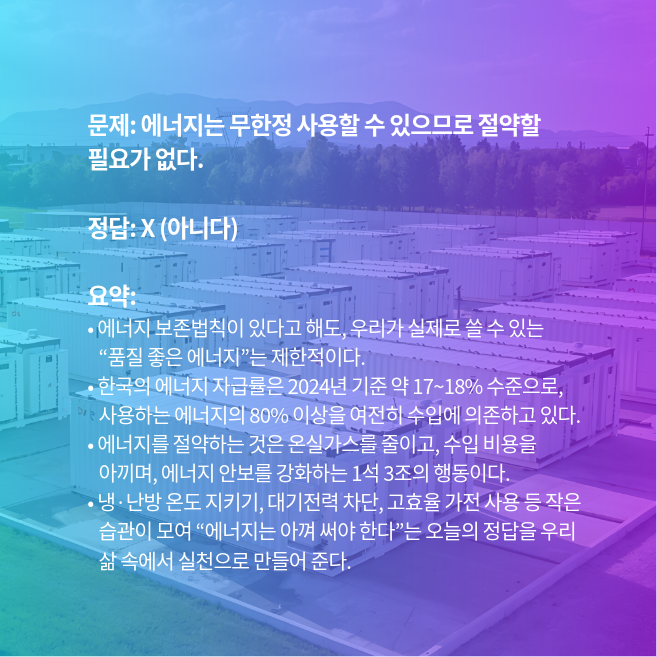 📘 오늘의 주제: 에너지 보존법 vs. 현실에서의 ‘사용 가능한 에너지’ · 한국의 낮은 에너지 자급률 · 왜 절약이 기후위기·에너지 안보를 동시에 지키는 해법인지 살펴봅니다.
