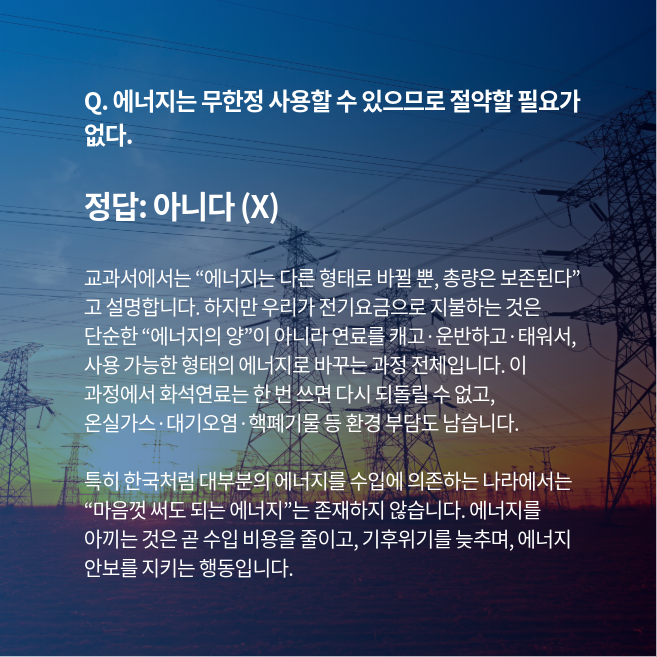 오늘 기후동행퀴즈 문제는 “에너지는 무한정 사용할 수 있으므로 절약할 필요가 없다.”라는 문장이었습니다. 물리학에서는 “에너지는 사라지지 않는다”고 배우지만, 우리의 일상에서 중요한 것은 “얼마나 많은 에너지를 쓸 수 있느냐”가 아니라 “환경을 해치지 않으면서, 경제적으로 감당 가능한 에너지를 얼마나 확보할 수 있는가”입니다. 이번 원고에서는 한국의 에너지 자급률 현실까지 함께 보며, 왜 에너지 절약이 여전히 가장 확실한 기후 행동인지 정리해 봅니다.