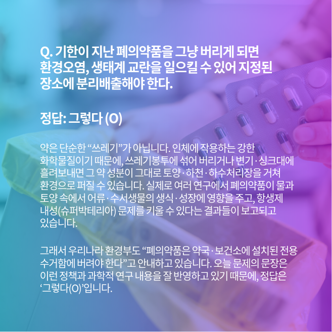 📘 오늘의 주제: 폐의약품이 환경에 미치는 영향 · 생태계 교란과 항생제 내성 문제 · 우리나라에서 폐의약품을 올바르게 배출하는 방법