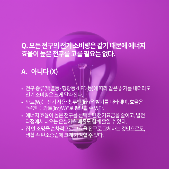 실제 가정에서는 방·주방·거실·현관·욕실까지 조명이 여러 개 있기 때문에, 집 안 전체를 순차적으로 고효율 전구로 교체하면 “눈에 안 보이지만 꾸준히 쌓이는 절감 효과”가 상당히 커집니다. 오늘 기후동행퀴즈는 그 첫 번째 출발점으로, “전구는 다 똑같지 않다”는 사실을 확인하는 문제라고 볼 수 있습니다.