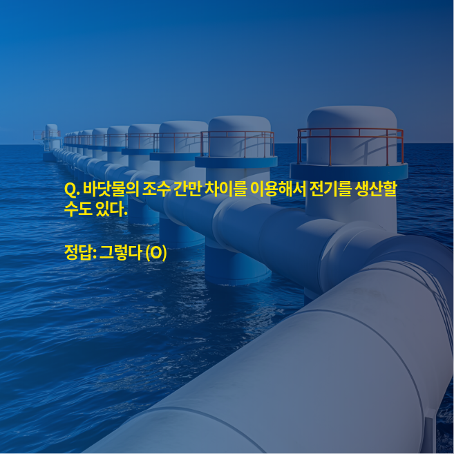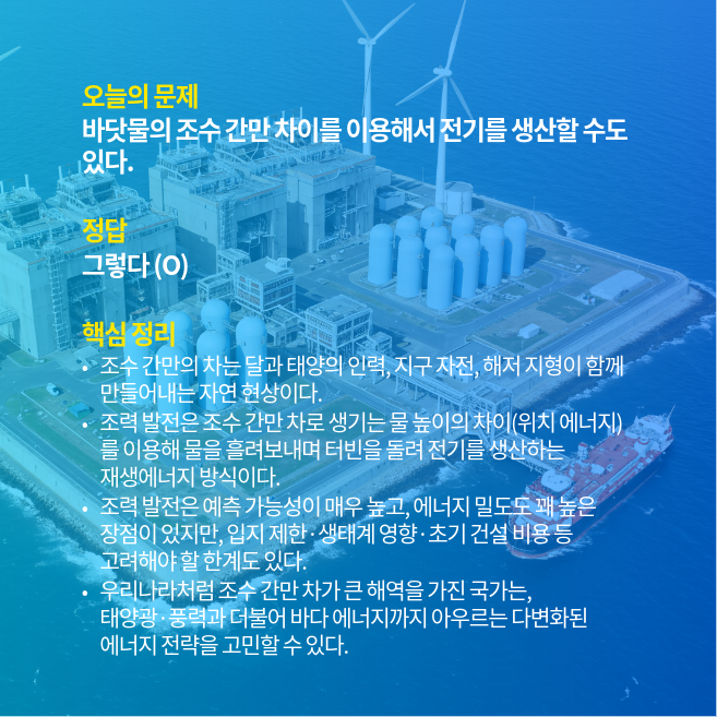 즉, 조수 간만의 차는 그 자체가 거대한 “자연의 물탱크”이자 위치 에너지를 담고 있는 일종의 자연 배터리라고 볼 수 있습니다. 오늘 문제의 문장은 이런 조력 발전의 개념을 담고 있기 때문에 참(O)이 됩니다.